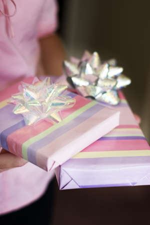 Woman dressed in pink holds pastel colored wrapped gifts that have sparkling bows on them.