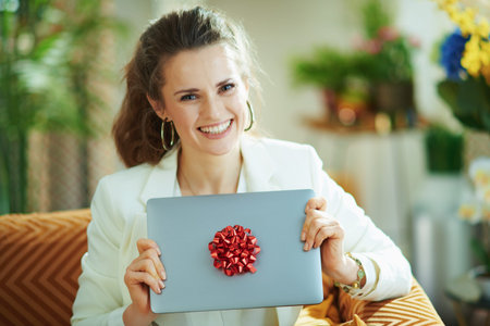 Portrait of smiling stylish woman in white blouse and jacket showing gift laptop with red bow in the modern house in sunny day.
