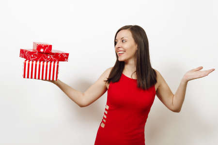 Beautiful caucasian young happy woman dressed in red dress spreading hands holding gift boxes on white background.