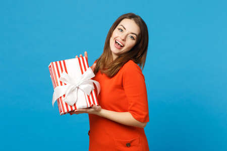Beautiful young woman wearing red orange dress hold red striped present box with gift ribbon isolated over trendy blue background studio portrait. People lifestyle fashion concept. Mock up copy space