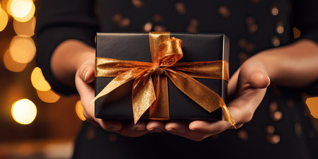 Close up photo of black gift box in female hands. Girl holding a beautiful gift box in her hands. Copy space.
