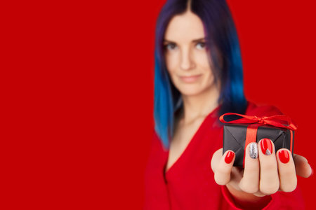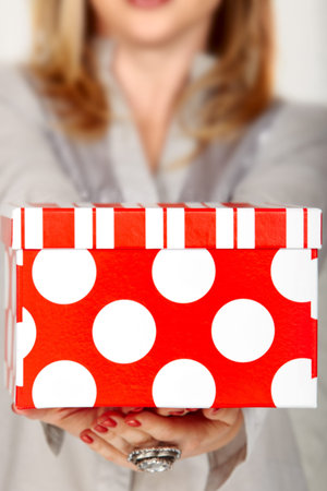 woman holding a gift red box with white polka dot and stipe - focus on the box.