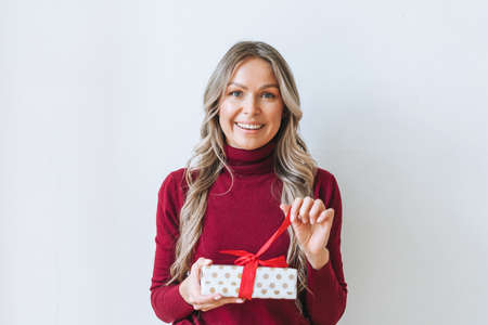 Portrait of happy young adult beautiful woman with blonde long curly hair in bordo sweater with gift box red ribbon in hands on the gray background isolated, winter warm clothes