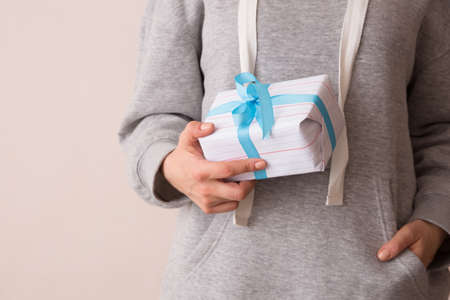 Woman hands with white sweater holding a small gift box for special event with copy space. Christmas, birthday or new year concept.