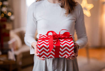 Horizontal close-up of unrecognizable woman holding Christmas gift, with copy space.