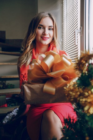 happy girl with gift box. beautiful young woman, stay near the window and christmas tree. winter home lifestyle. Happy New Year
