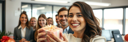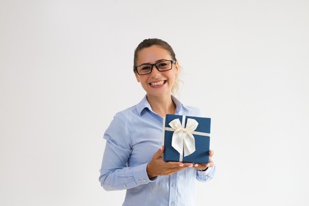 Happy young businesswoman excited with her special day. Joyful broadly smiling Caucasian woman showing present pack at camera. Celebration and special day concept