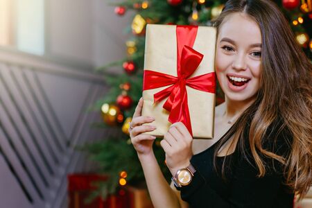 Beautiful young girl hold gift and surpised sitting near christmas tree at home. Gold gift with red bow