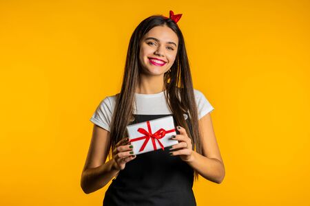Young cute girl smiling and holding present box on yellow studio background. Woman in red headband. New year mood.