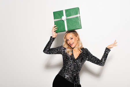 cheerful blonde woman in elegant blouse posing with green gift box on head on white