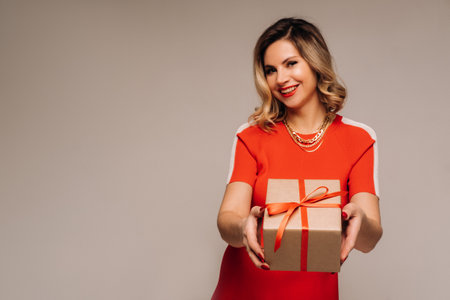 A girl in a red dress stands with gifts in her hands on a gray background.