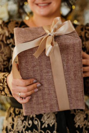 Womens hands with a gift. A woman holds a beautiful gift box in her hands. Festive mood, concept of Christmas gifts.