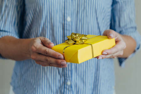 Unrecognizable Woman in sweeater holding in hand present, gift box on yellow background. Close-up photo, Gift Concept.