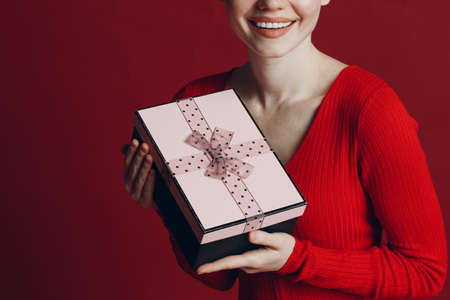 Pretty girl is wearing red dress holding gift box. Smiling beautiful woman portrait isolated on black background.