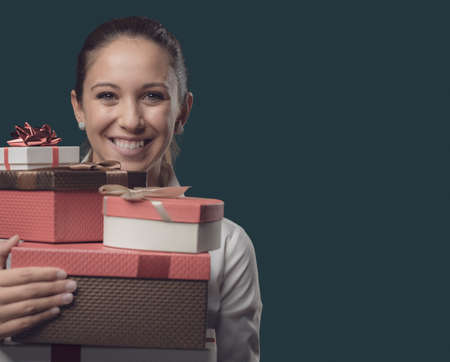 Happy young woman holding a lot of gift boxes, Christmas shopping and celebration concept