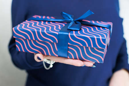 Female hands with long nails hold a gift box in blue colors