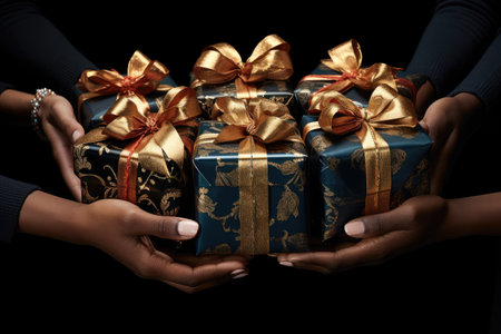 An overhead selective closeup shot of a person giving a wrapped gift box to another person