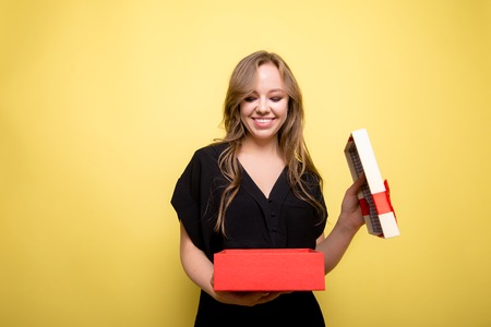 Young woman in yellow swether holding gift box for spacial event. Christmas, birthday, valentine's background concept.
