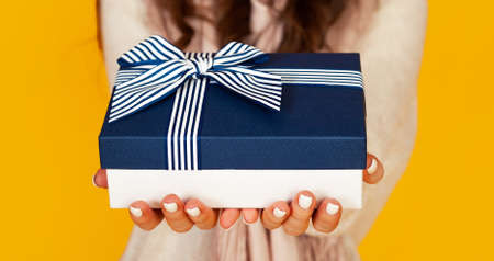 Female holds a gift box on blue background. Holiday concept. Front view