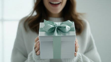 Happy woman with a gift falling in her hands for birthday, anniversary, wedding, Valentines day or Christmas, luxury holiday present or beauty box subscription delivery concept
