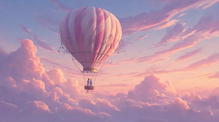 Two people are in a hot air balloon with pink and white stripes, rising through fluffy clouds at sunrise.