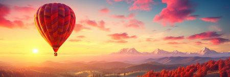 Hot air balloon flying over the mountains at sunrise. Panoramic view.