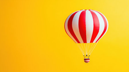 A striking hot air balloon featuring bold red and white stripes elegantly ascends against a vibrant yellow backdrop, evoking a sense of adventure and joy.