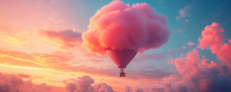 Hot air balloon with cloud in sunset sky, surreal scene. Adventure and dream concept