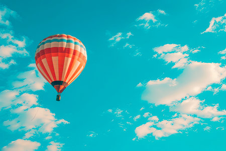 A vibrant hot air balloon ascends into the sky, showcasing an array of bright colors. The serene atmosphere and fluffy clouds create an idyllic scene, perfect for travel enthusiasts and adventure seekers.