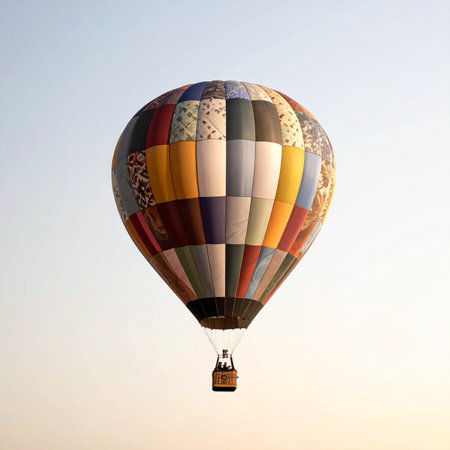 Intricately designed hot air balloon, featuring a mosaic of vivid colors, floats elegantly against a tranquil, clear sky backdrop indicative of early morning light.