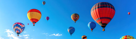 Colorful hot air balloons against a clear blue sky, vibrant, highangle view