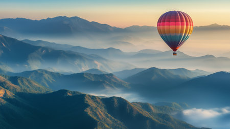 A vibrant hot air balloon floats above misty mountain ranges at sunrise, offering breathtaking views of natures beauty
