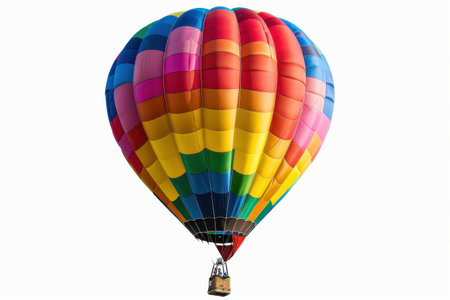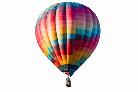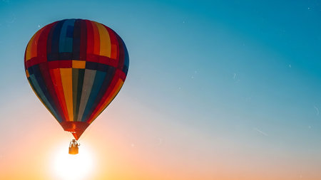A stunning hot air balloon with vibrant colors floats isolated in the clear blue sky, ideal for travel and adventure themes. Perfect for stock photography use.