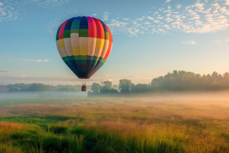 A colorful hot air balloon ascends gracefully over tranquil, foggy fields as dawn breaks.