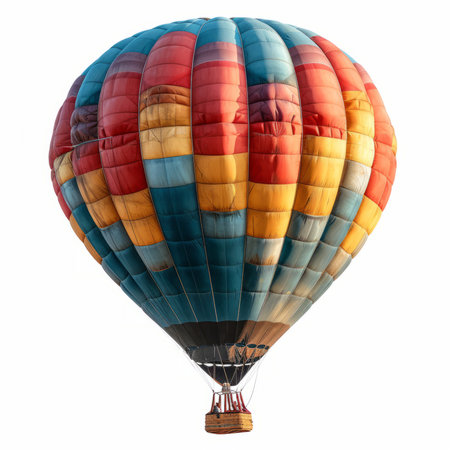 A colorful hot air balloon with a woven basket is ascending against a white sky. The balloon has a striped design with red, yellow, blue, green, and pink patches, creating a vibrant and eye-catching spectacle.