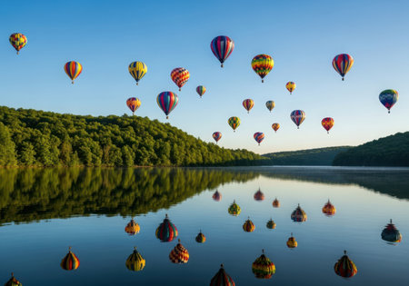 A scenic landscape featuring numerous hot air balloons ascending into the sky, their colorful reflections mirrored in the calm water below. The image captures a serene natural environment with a lush forest and clear blue sky.