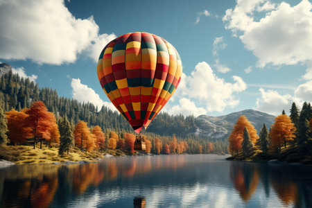 Hot Air Balloon Hovering Over a Calm Lake with Green Landscape and Reflection. Concept of Adventure, Tranquility, Nature, Outdoor Activity.