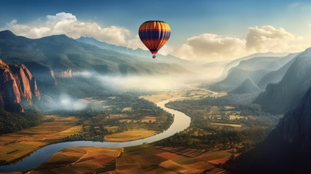 Journey in a hot air balloon over the mountains. AI generative.