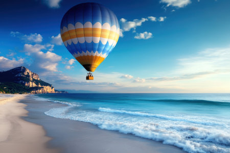 A vibrant hot air balloon drifts over gentle ocean waves, with a beautiful beach and cliffs in the background.