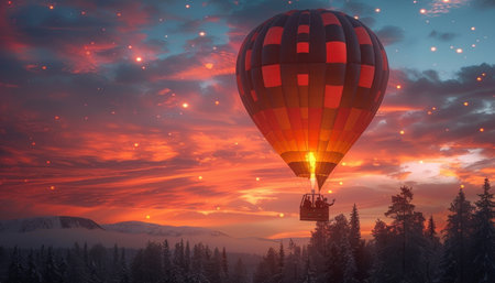 As sun rises over horizon, vibrant hot air balloon glides through sky, carrying passengers to their destination and painting breathtaking landscape of billowing clouds and shimmering rivers below