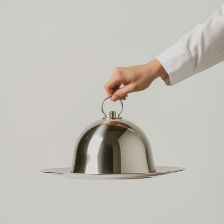 Waiters hand holding a shiny silver cloche, symbolizing service and fine dining.