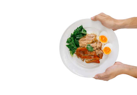 Hand holding Stewed Pork Leg on Rice on white background. Delicious street food, high calorie foods, fast food that have many fat.