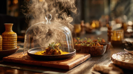 A captivating Indian dish is presented under a glass cloche, with steam rising, highlighting vibrant spices and aromatic herbs on a rustic wooden table.