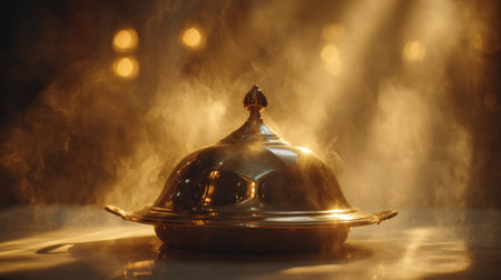 This stunning image captures an elegant silver serving dish accentuated by dramatic lighting and enveloping steam. The warm atmosphere invites culinary exploration.