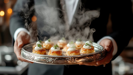 A suited waiter holds a decorative silver tray filled with beautifully plated gourmet appetizers, steam gently rising, highlighting a sophisticated dining experience at a luxurious venue.