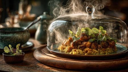 A captivating image of a steaming dish of aromatic rice topped with tender meat and garnished with fresh mint, all elegantly presented under a glass dome.