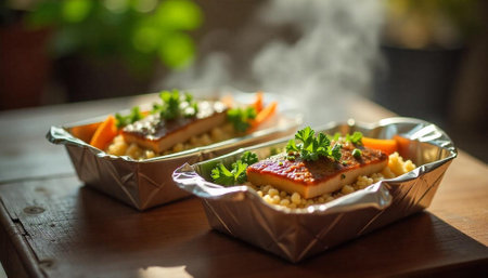 A steaming bowl next to a dish of grilled fish and fresh vegetables, capturing a wholesome and healthy dining experience.