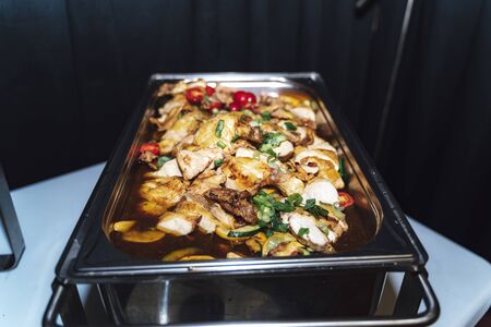 Stainless hotel pan on food warmer with roasted meat pieces and vegetable. Self-service buffet table. Celebration, party, birthday or wedding concept.
