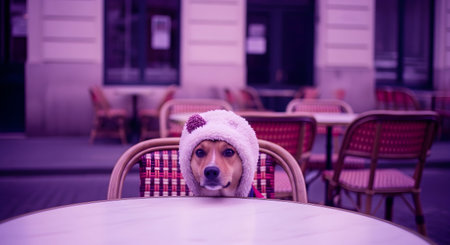 A curious dog wearing a warm hat gazes thoughtfully while droplets gather on its fur.