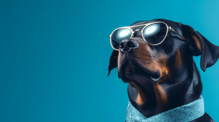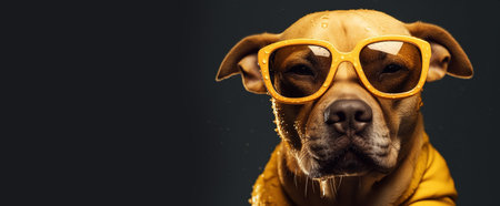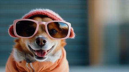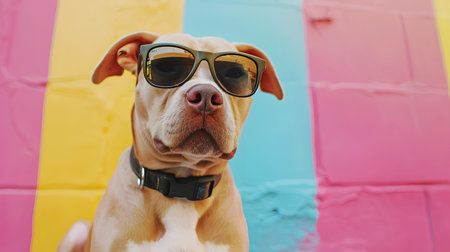 Cool dog with sunglasses on colorful wall background. Space for text, Generative AI